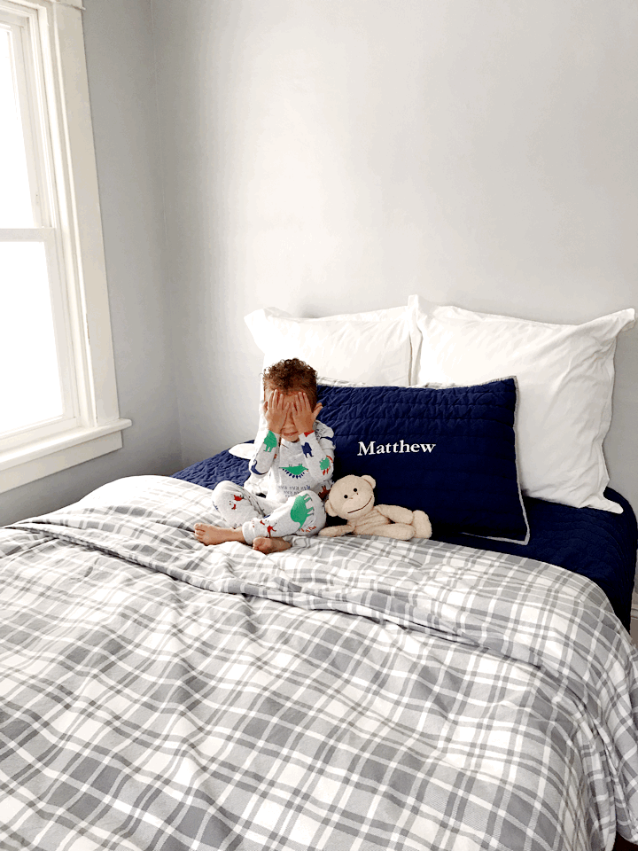 We transitioned Matthew in to a big bed back in Texas about a year ago today. We needed the crib for our third child, so we basically booted Matthew out of his crib in to a big boy bed to make room for our new life with three kids. He handled the transition really well and thought he was cooler than a winter breeze and welcomed the change. Ben and I liked that he would be in a big boy bed, but not so excited about the bed choice at the time. We had to move him in to a twin size bed and that is something I NEVER wanted my kids to sleep in; I like to snuggle with my kid and twin size beds are not big enough for cuddle time.