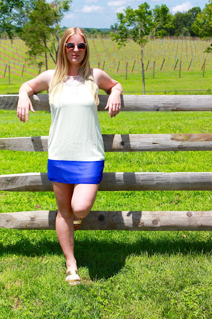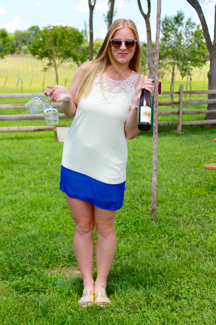 In getting ready to head out to the Winery, I grabbed my easy breezy shift dress from Pink Blush. I wanted to wear something that felt effortless to keep me cool in the humidity. I was looking to make a bold statement; nothing too fancy, but nothing too casual either. This dress has the best of both worlds and here is why: the crochet neckline says “I’m comfy and laid back” while the blue color block says “watch out, I’m here and I’m fabulous.”