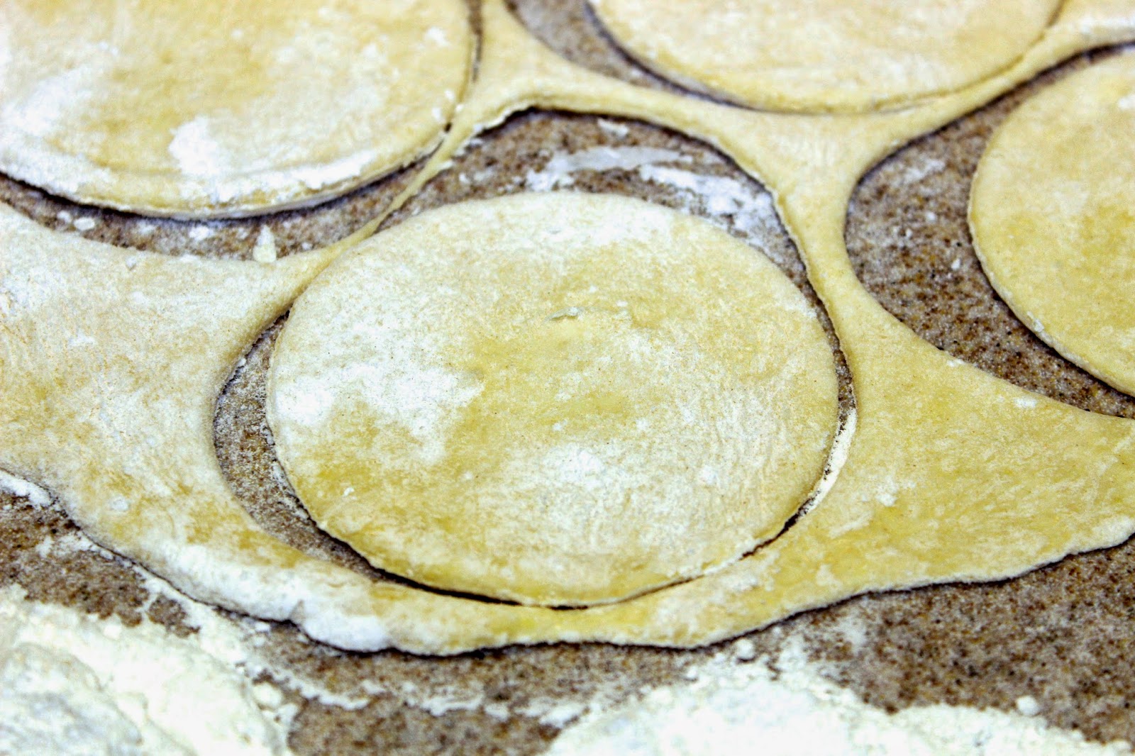 7. Place a small portion of the sauerkraut filling in the middle of the circle cut dough.