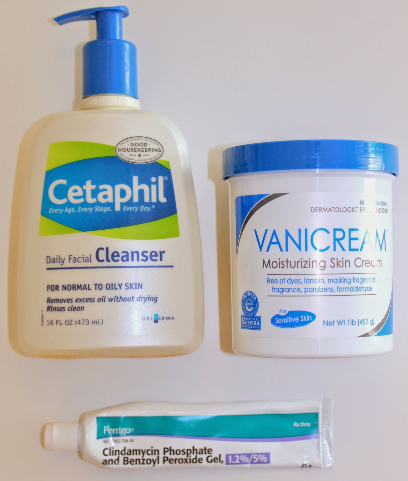 During the Fall and Winter, I use both my ‘Normal to Oily Skin Routine’ trio and my ‘Normal to Dry Skin Routine’ trio. In the mornings I follow the above steps for my ‘Normal to Oily Skin Routine’ and in the evenings before bed, I use my ‘Normal to Dry Skin Routine’ trio. For my ‘Normal to Dry Skin Routine’ trio, I wash my face with Cetaphil daily facial cleanser and rinse with cool water to seal my pores, dab my face with a towel (wiping your face will cause your skin to become irritated and old skin particles will be pushed into your pores creating more acne), apply Clindamycin product such as ‘Duac’, let face dry, and apply my lotion for sensitive skin- Vanicream. Vanicream is used on acne prone skin, sensitive skin, and Eczema. This lotion goes on very heavy, so I use it as my night cream to keep my skin moisturized during the colder, more dry months of the year.